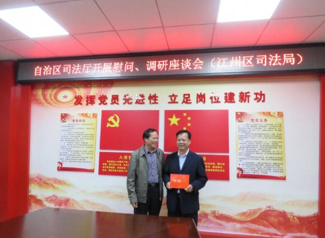 1月7日讯(凌文春)1月6日,自治区司法厅调研组韦军运一行到崇左市江州区司法局开展安全维稳工作调研及慰问活动,全力确保司法行政安全稳定工作平稳运行。 自治区司法...