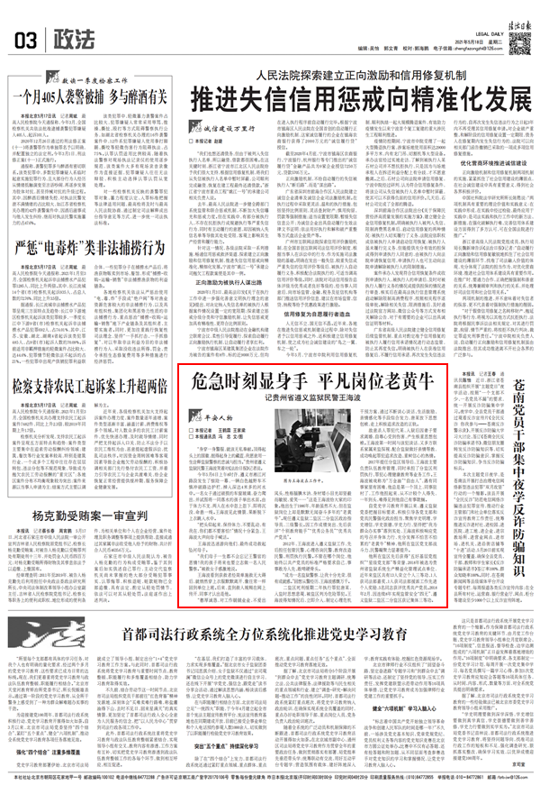 5月18日,《法治日报》政法版刊发了《危急时刻显身手平凡岗位老黄牛》的文章。