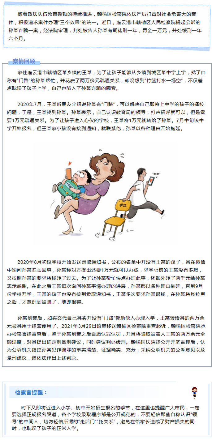 谎称有“门路”办理入学,实则是诈骗 连云港市赣榆区检察官:选择正规报名渠道
