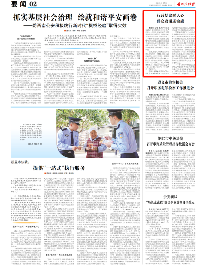 2024年5月23日,《贵州法治报》要闻版刊发了《行政复议暖人心 群众致谢送锦旗》,全文如下: