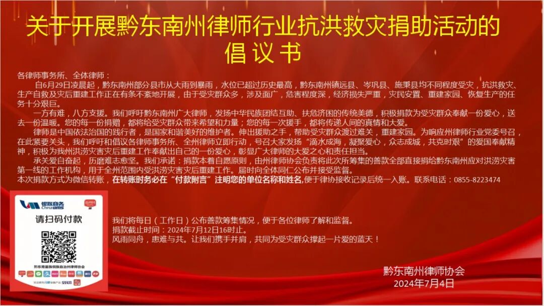 为帮助灾区群众恢复生产、重建家园,黔东南州律师行业党委和州律师协会向全州律师事务所、广大律师及工作人员发出倡议,号召大家积极行动,弘扬中华民族“一方有难、八方支援”的传统美德,向灾区群众伸出援助之手,奉献爱心,捐款捐物,支援镇远县灾后重建,共渡难关。截至目前,全州律师事务所、律师及工作人员共捐款47744.6元。